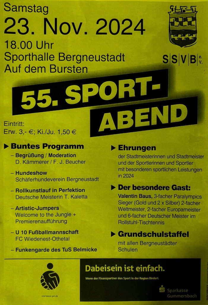 55. Sportabend in Bergneustadt 15. November 202415. November 2024 Kalender Wann: 23. November 2024 um 18:00 – 23:45 2024-11-23T18:00:00+01:00 2024-11-23T23:45:00+01:00 SSV08